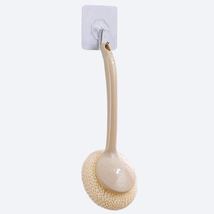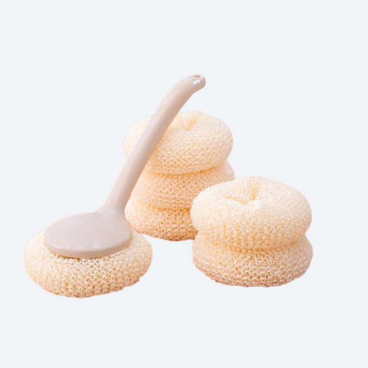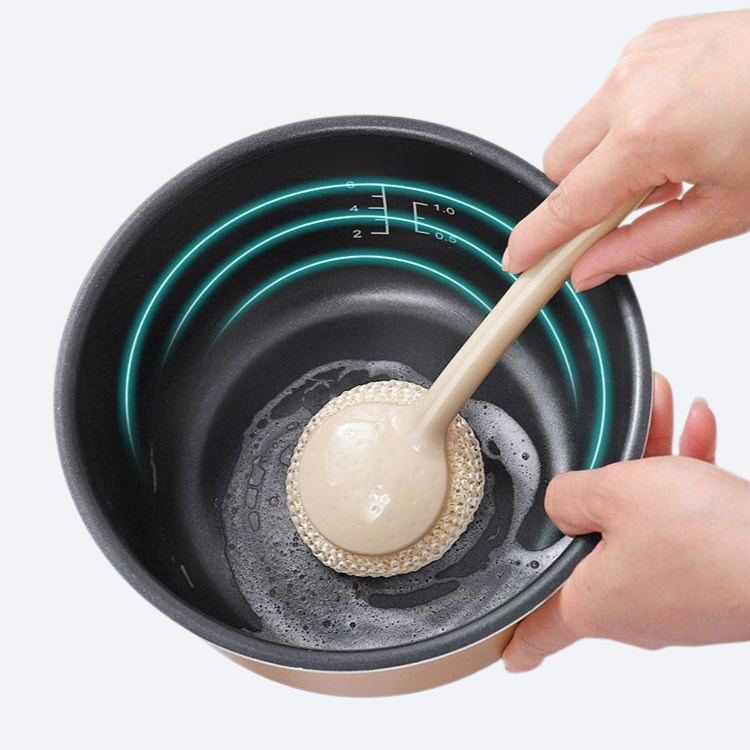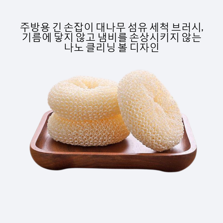 대나무 섬유로 제작된 긴 손잡이 냄비 브러시. 환경 친화적 소재, 강력한 세척력, 손쉬운 사용, 내구성 우수, 위생적 관리 가능.